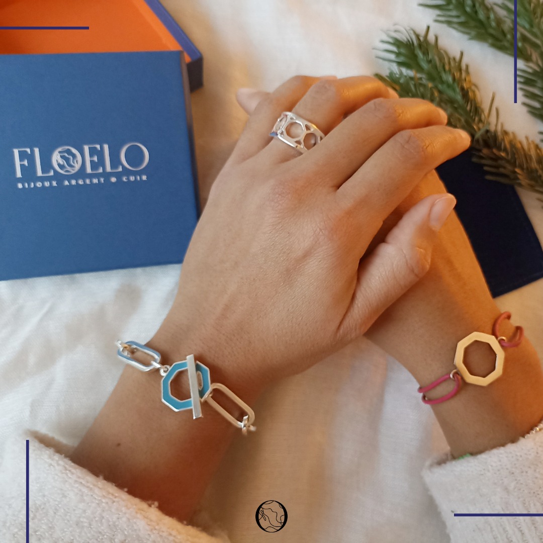 Un bracelet en argent avec un octogone vert olive… Un collier en cuir avec un pendentif en argent… Des boucles