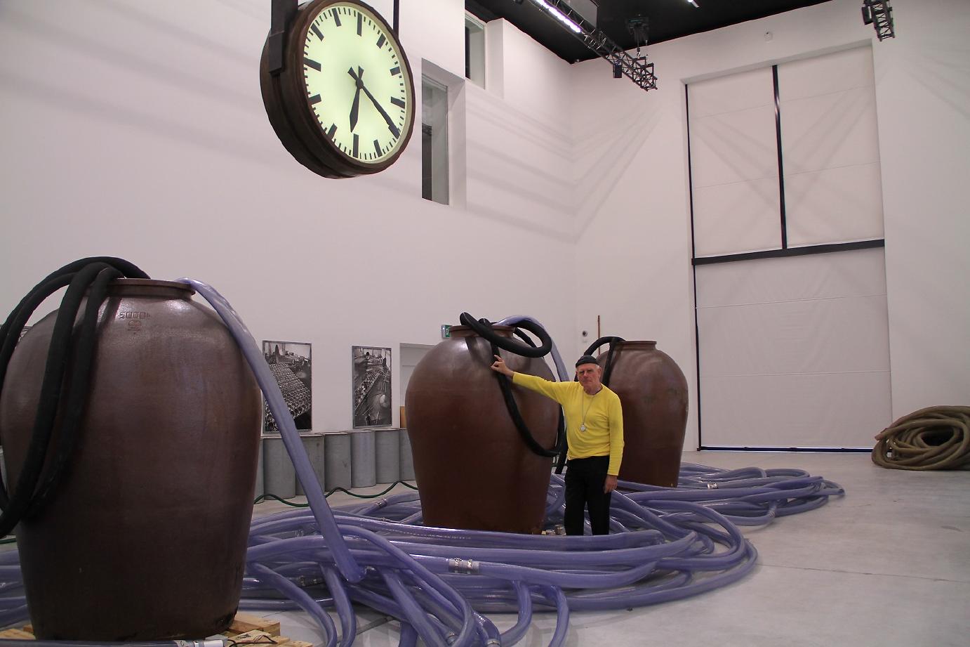Figure de cette école, Klaus Rinke n’est pas en reste puisqu’il investit de son côté la Nef pour une réinterprétation de son « Instrumentarium » qu’il avait présenté en 1985 dans la fosse du Centre Pompidou. En acheminant de l’eau de 12 rivières européennes qu’il mélange au sein de 4 jarres géantes représentant les 4 points cardinaux, Klaus Rinke poursuit ici son travail sur l’eau et le temps, deux éléments symbolisant l’écoulement et l’insaisissable, mais aussi l’inquiétude de l’artiste envers l’avenir, face au repli sur soi en Europe. Un façon de « provoquer les consciences » explique l’artiste qui voit dans les rivières, la matrice même de la culture européenne construite au fil des siècles à travers ces voies naturelles de communication.
