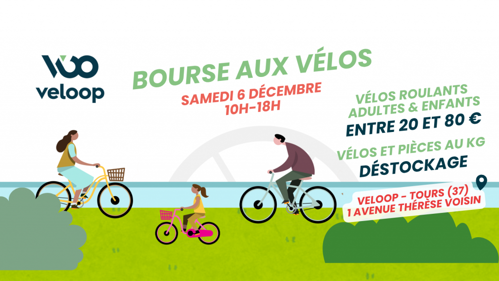 Grande Bourse aux Vélos – Samedi 6 décembre à Tours ! VELOOP, la coopérative tourangelle qui agit pour le réemploi du vélo, organise sa 3ème Bourses aux Vélos samedi 6 décembre au 1 avenue Thérèse Voisin, à Tours, de 10h à 18h ! Au programme : Des vélos adultes & enfants prêts à rouler entre 20€ et 80€ Des vélos en l’état ou pour pièces à petits prix (à partir de 10€) DÉSTOCKAGE de pièces détachées d’occasion vendues au poids : fourches, pédaliers, dérailleurs, roues, pneumatiques… Paiement en espèces ou par CB Venez faire de bonnes affaires, donner une seconde vie à un vélo et soutenir une démarche éco-responsable