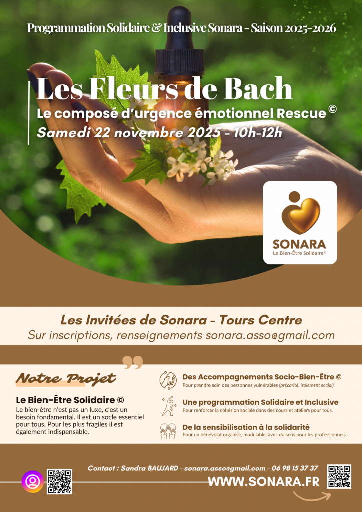 Vous connaissez le composé d’urgence émotionnelle « Rescue »? Mais connaissez vous sa composition, quand et comment l’utiliser de façon optimale ? Lors de cet atelier découverte Fleurs de Bach, nous parlerons ensemble d’urgence émotionnelle et partagerons les expériences de nos moments « SOS ». A la fin de l’atelier, chaque participant saura pleinement utiliser ce merveilleux outil de recentrage et recevra un flacon personnalisé pour cheminer vers plus de mieux-être .