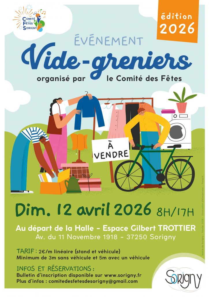 Avec le printemps vient le grand nettoyage. Videz, triez, faites de la place dans vos armoires, placards, garages et greniers. Le Comité des Fêtes de Sorigny vous propose de participer le dimanche 12 avril 2026 au vide-greniers de printemps, depuis la Halle. Inscrivez-vous pour réserver votre emplacement, au plus tard le 25 mars. Bulletin d’inscription disponible sur www.sorigny.fr
