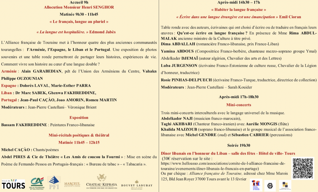 “Papa, sur une carte ça se situe où le Liban ?” Voilà une question que ne posera plus votre enfant après que vous l’ayez amené à la journée “Le Français en partage”, prévue ce samedi toute la journée à l’Hôtel de Ville de Tours. Organisée par l’Alliance Française de Touraine, cette journée honore les quatre plus anciennes communautés tourangelles : L’Arménie, le Portugal, l’Espagne et donc le Liban. Table ronde, exposition, récit poétique et théâtral, concert, voici la programmation de la journée. Et pour couronner le tout, histoire de sentir les saveurs orientales, un dîner de spécialités libanaises. Miam.