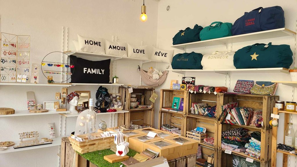 Dans le petit espace : que des créations artisanales, presque toujours fabriquées en France (et parfois dans des pays voisins comme l’Italie). « J’ai dû travailler avec une centaine de marques » nous raconte celle qui fait elle-même des bougies ou des affiches mais qui présente aussi des coussins, des confitures, du miel, du savon… et des bijoux, le produit qui intéresse le plus de monde. « J’ai un fonds de permanents et je renouvelle le reste tous les 4 mois, comme ça il y a toujours une période faste ». Le moment le plus fort c’est Noël mais la fin de printemps cartonne aussi avec la Fête des Mères et les cadeaux de fin d’année pour les maîtresses.