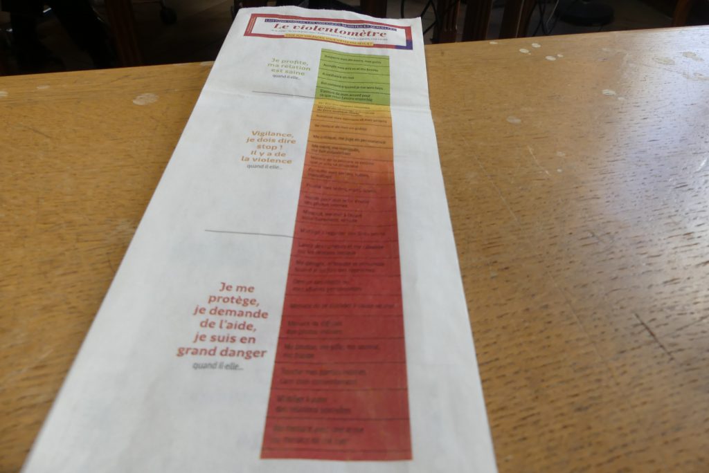 Ces étuis en papier recyclé qu’on peut mettre au compost sont composés de deux faces : la première répertorie les différents numéros d’urgence à contacter quand on est victime comme le 39 19, ligne d’écoute dédiée aux femmes qui subissent des violences et accessibles 24h/24, 7 jours sur 7. De l’autre côté, on trouve le Violentomètre, un outil déployé pour déterminer les comportements anormaux dans un couple.