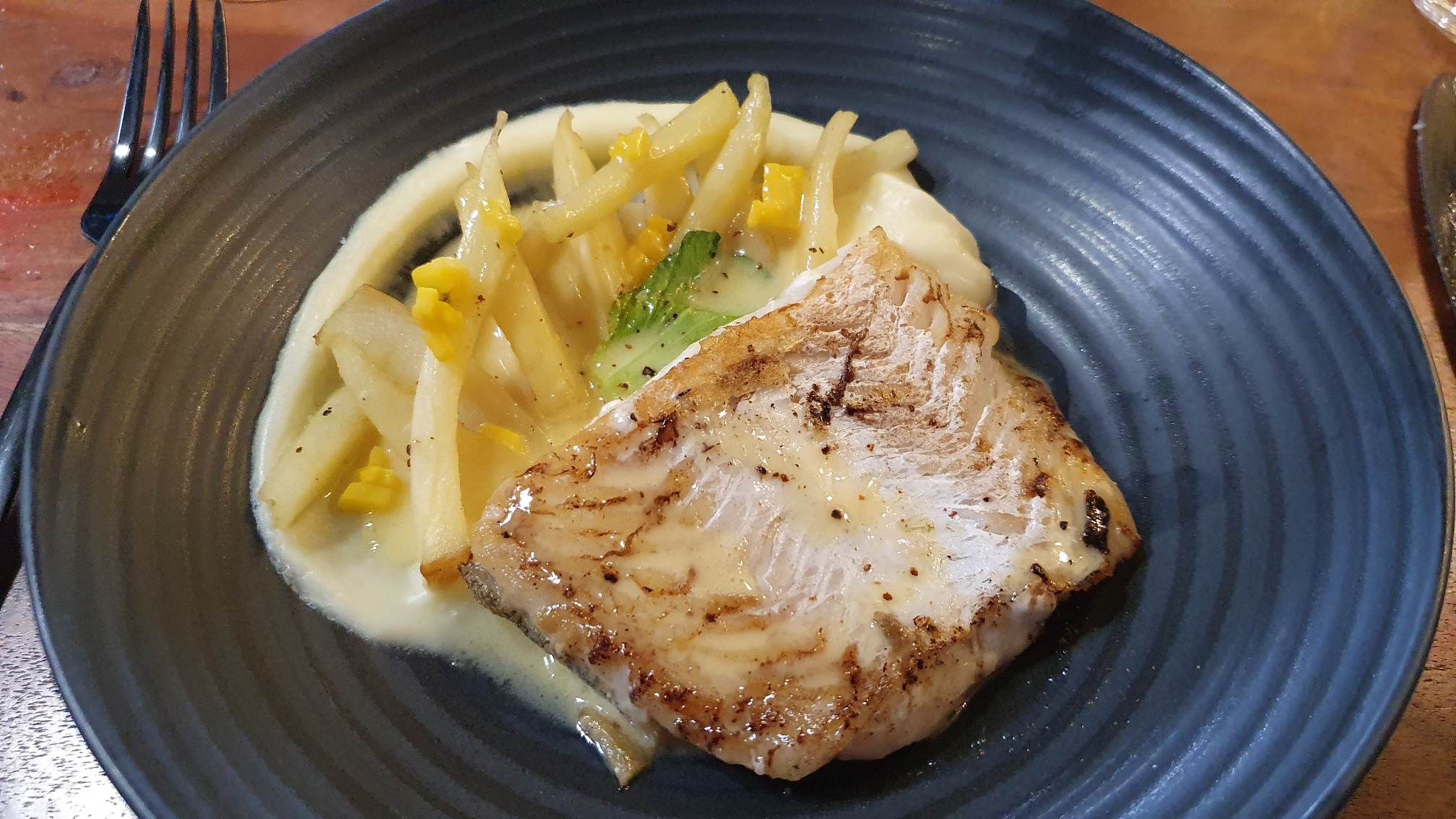 On se laisse d’abord tenter par un feuilleté de saumon fumé sur place, accompagné de sa petite salade justement assaisonnée. La pâte feuilletée ne part pas dans tous les sens, le saumon est bien réalisé : c’est une réussite, tout comme l’œuf parfait ou le petit pad thaï de bœuf avec nouilles de sarrasin. Pour le plat, on se fait servir un aiglefin avec panais, jus de volaille et fruits exotiques. Un poisson à la juste cuisson, des légumes fondants… Une réussite, comme l’est aussi l’onglet avec écrasé de pomme de terre et jus réduit à l’estragon. Le tout bien présenté, servi rapidement et avec le sourire. On recommande.