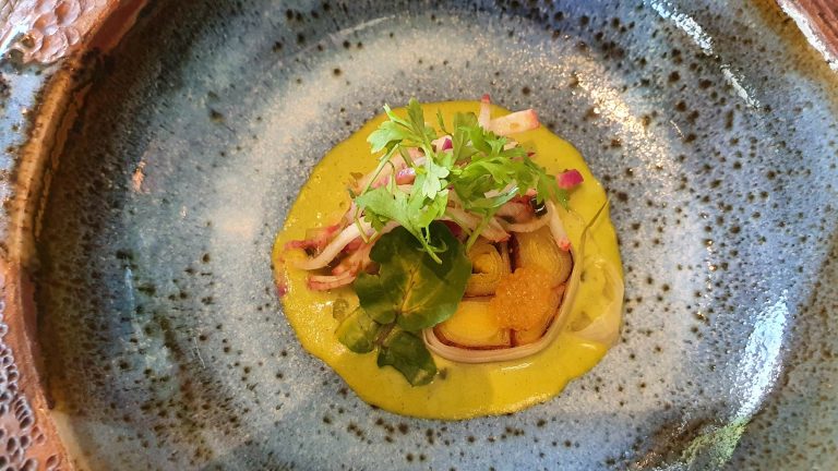 On est venu là pour tester dans les grandes largeurs et on prend donc une formule sensation en 7 temps, précédée d’un premier verre de vin pour voir où peut nous emmener le sommelier (précédemment en poste aux Hautes Roches, autre étoilé du département). Souriant, didactique et surprenant, c’est lui qui nous a fait profiter des plus belles sensations, envoyant fort dès le départ avec un vin… de Vendée, en l’occurrence un blanc très minéral de Thierry Michon au domaine St Nicolas. Le reste de ses services furent irréprochables. Une pointure.