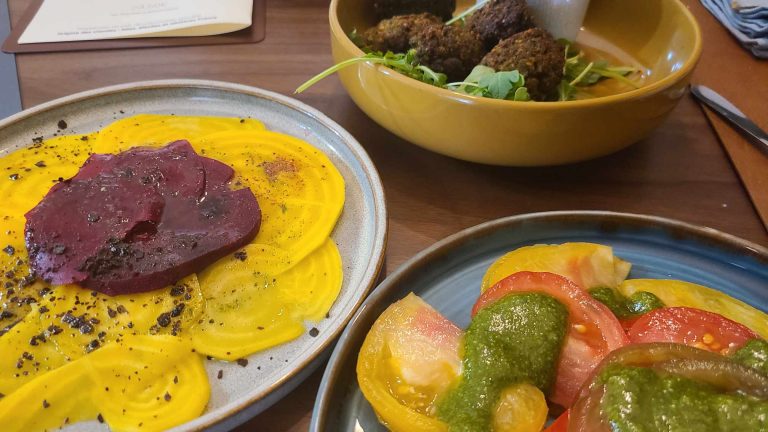 Si certains mets manquaient peut-être un peu d’assaisonnement, on salue la simplicité et la sincérité des recettes : on sent que les produits sont sélectionnés avec soin, et on salue l’effort du pain ou des falafels maison. La carte des boissons est tout aussi séduisante avec un cocktail pêche de vigne-pétillant parfaitement adapté au moment.