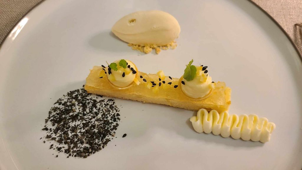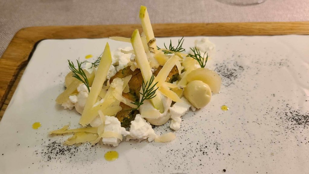 Derrière, on se délecte d’une langoustine avec carottes et – encore – quelques agrumes, un fil tissé tout au long du repas. La prouesse est ce plat de poisson : barbu cresson. L’assaisonnement était divin. Pour la viande, le serveur se lâche sur la truffe pour recouvrir la poularde servie avec un gnocchi de châtaigne. Derrière arrive ce qui semble devenir le plat Signature de la maison : Sainte-Maure fumé, fenouil, pomme avec biscuit aneth. De quoi mériter les honneurs.