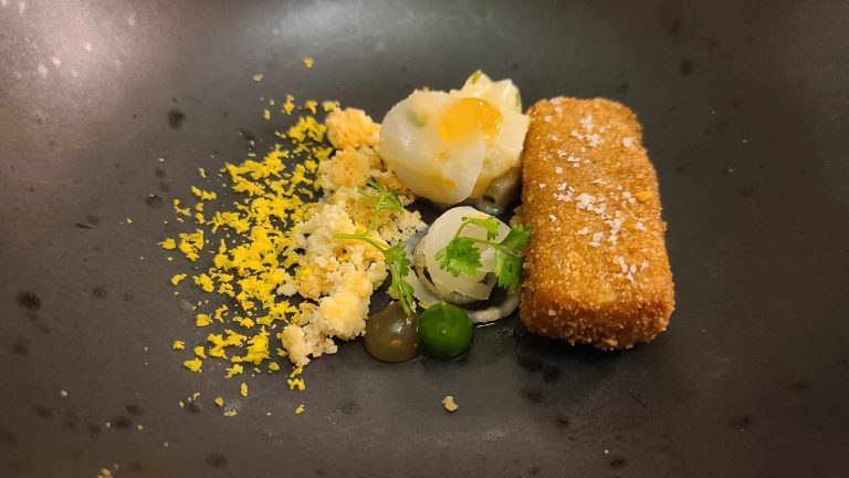 Nous on a opté pour le menu L’Envol : 7 services tout à l’aveugle. Cela commence avec un trio d’amuse-bouche dont une soyeuse betterave aux herbes et une déroutante mais séduisante bouchée foie gras / orange. S’ensuit une entrée qui emmène la polenta au sommet. Cet accompagnement populaire est tout à sa place aux côtés du céleri, d’un jaune d’œuf confit et d’un crumble au parmesan, le tout dans une assiette très bien présentée.
