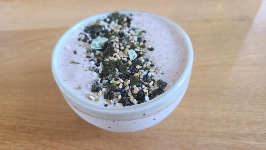 Derrière, la kefta de bœuf de Cheillé manquait sans doute un peu d’assaisonnement mais voilà une recette qui met en valeur une spécialité de Touraine de saison par excellence : l’asperge, ici servie en garniture et dans un bouillon au ponzu. On valide.