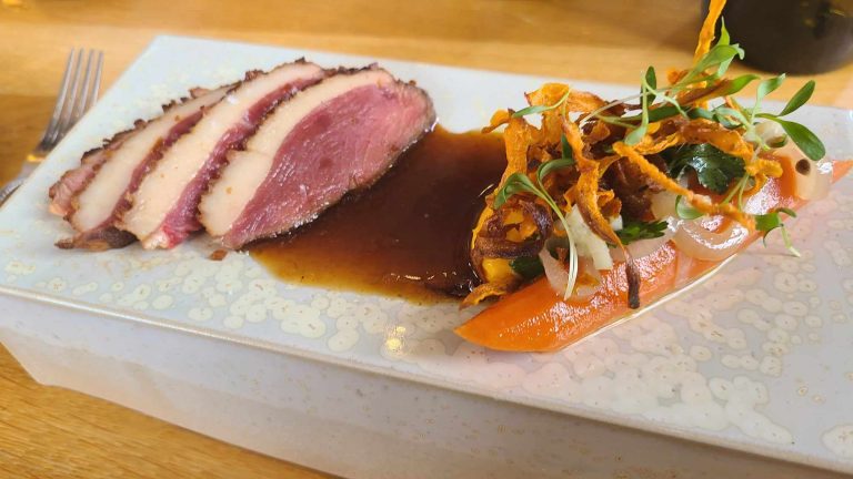 Le jour de notre venu, on débute par un formidable tataki de magret de canard avec variation de carottes bio, coriandre et condiment à la mangue de Madagascar. La présentation sur un bloc de porcelaine est toute en élégance, tandis que la mise en bouche alliant le sésame et les champignons d’une de Cinq-Mars-la-Pile avait déjà fait son effet.