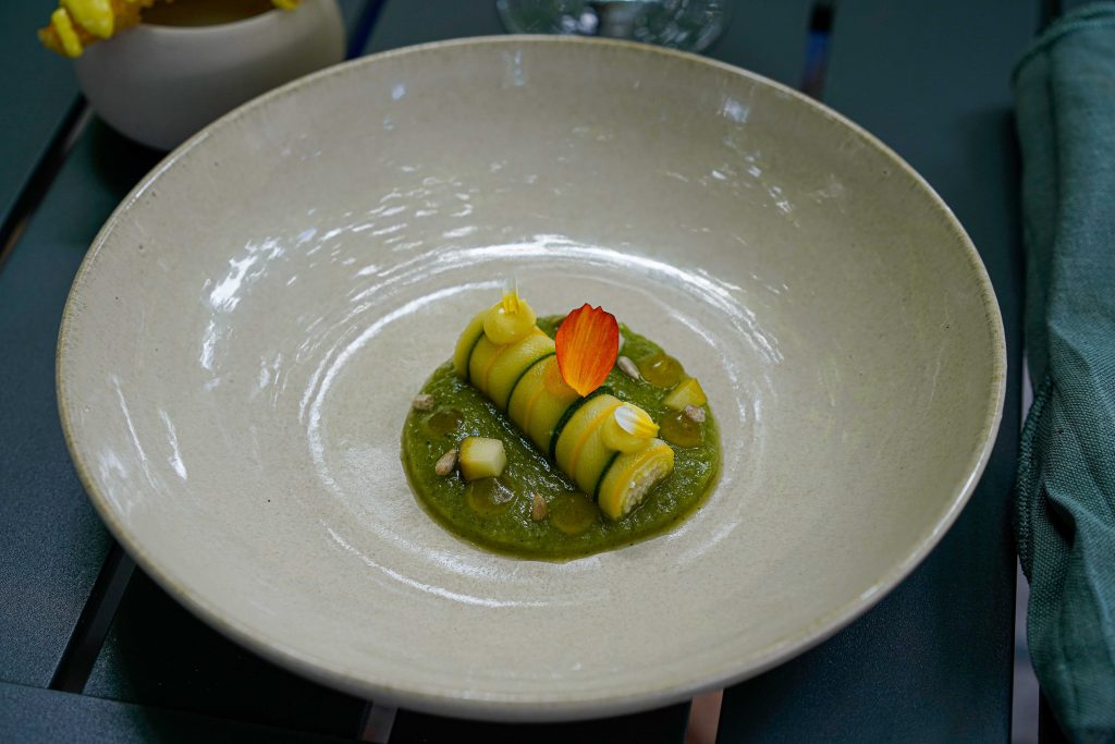 Puis vient l’entrée, un cannelloni de courgettes à la feta accompagné de courgettes en tempura à tremper dans une sauce aromatisée au kéfir.