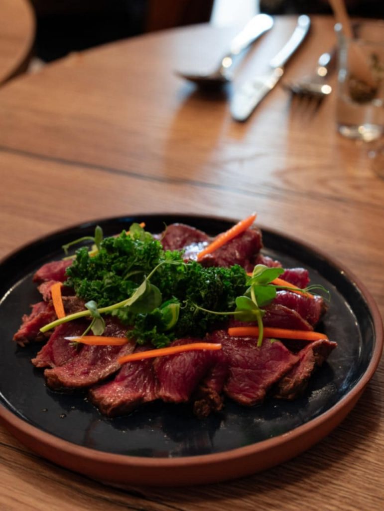 Pour les recettes, on est entre des totems de la cuisine réconfortante (os à moelle à 8€, millefeuille de pomme de terre à 6€) et la douce folie de la bistronomie, comme ce gravlax de maquereau avec houmous de lentilles corail au curry tout doux à 12€ qui arrive très joliment présenté, ou un tataki de bœuf à la viande fondante à souhait (18€).