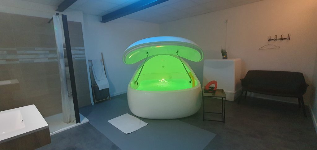 Ici, on vous propose en effet de vous couper du monde extérieur le temps d’une séance grâce à des caissons remplis d’une eau à 36° entièrement fermés (on peut néanmoins laisser le capot ouvert pour celles et ceux qui seraient claustrophobes). L’eau est chargée en sel de sulfate de magnésium (quatre fois plus dense que la mer Morte par exemple), permet de flotter intégralement sans efforts dans la bulle.
