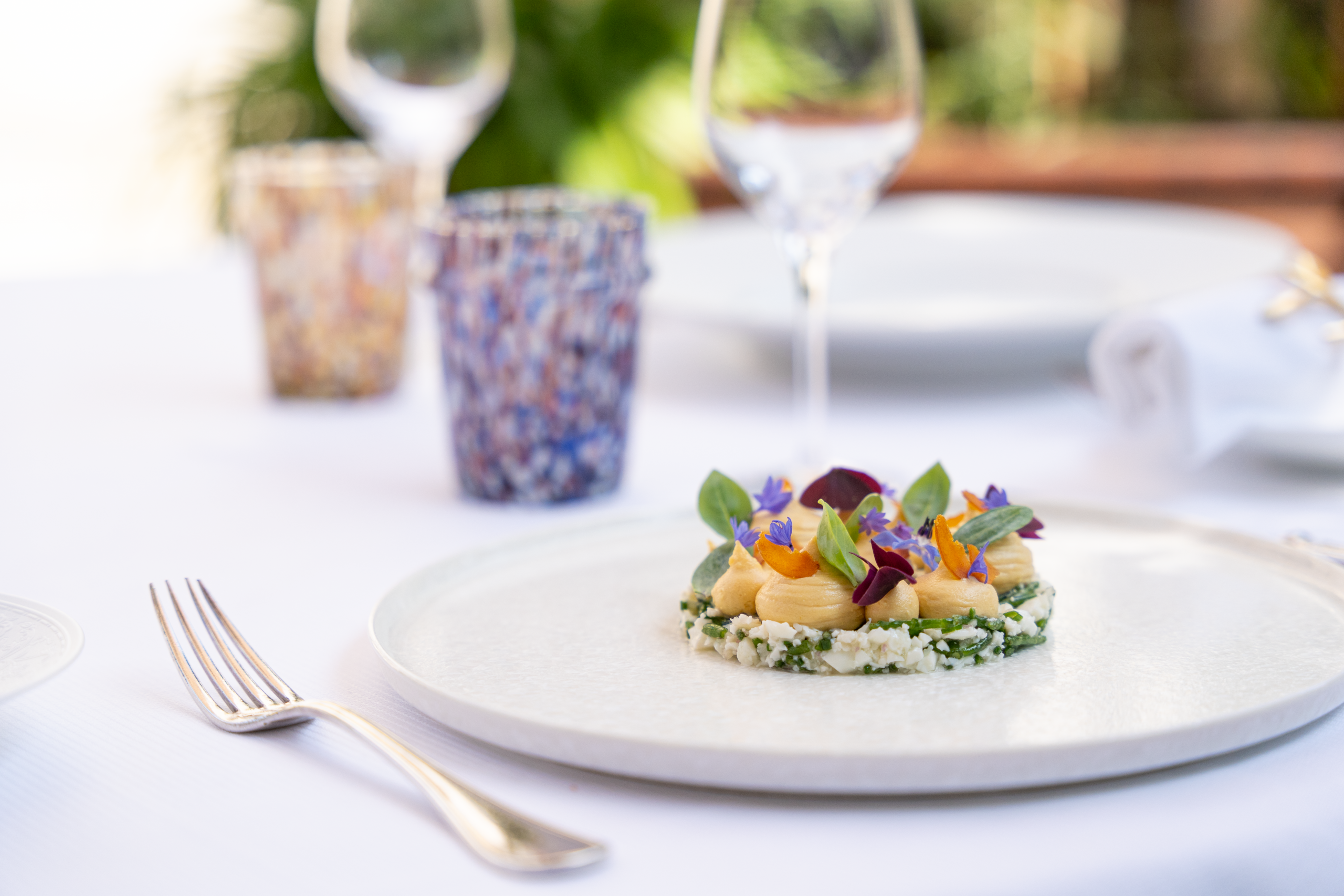 Ici, on vient pour une expérience globale. Cossue et intimiste. On s’installe confortablement dans des sièges fabriqués en France, autour de tables aux nappes blanches, dans des salons insonorisés, récemment rénovés. Ou sur la terrasse verdoyante aux beaux jours. Le service est aux petits soins grâce à une équipe expérimentée, comptant deux sommeliers. Et à partir de 6 personnes, on peut vivre un moment encore plus exclusif dans un salon privé.