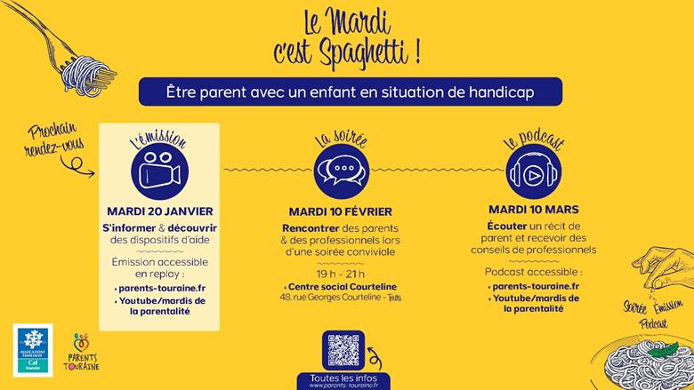 Les Mardis Spaghetti sont des rendez-vous mensuels organisés par le service Action sociale de la Caf Touraine, à destination des parents d’Indre-et-Loire. Ils sont gratuits, ouverts à tous et proposés sous trois formats différents (émission, soirée et podcast) autour d’un thème. Ils offrent l’opportunité de participer à des soirées, de regarder des émissions et d’écouter des podcasts sur des thématiques trimestrielles variées en rapport avec l’éducation et l’accompagnement des enfants. Psychopédagogue, médecin, diététicienne ou encore éducatrice de jeunes enfants y partagent leur expertise.