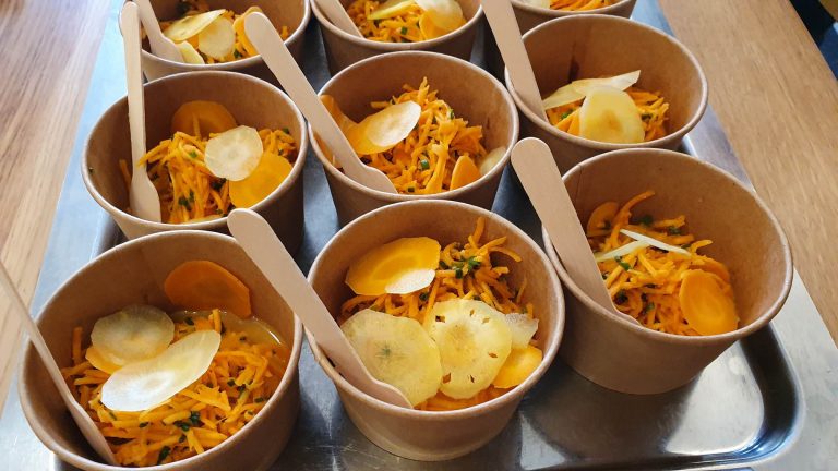 Ce défi, ça fait des mois que le cuisinier le prépare, notamment avec les maraîchers pour être sûr d’avoir assez de légumes à maturité le jour J. Il a aussi fallu trouver des recettes qui se mangent de préférence avec les doigts, et tiennent dans des contenants recyclables.