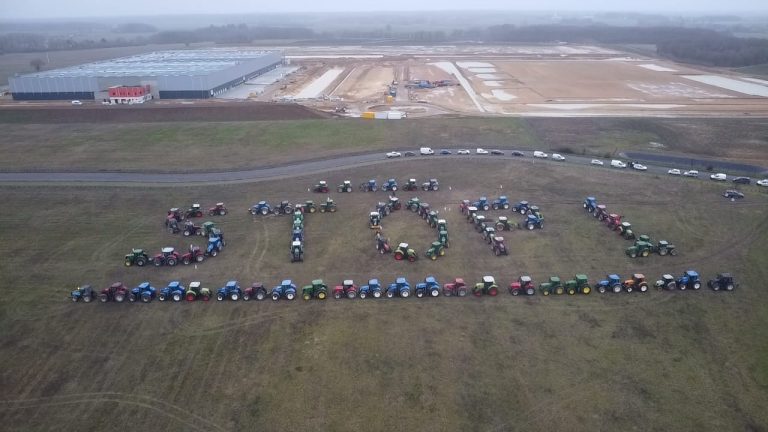 Ce mardi, l’antenne locale du 1er syndicat agricole a donc organisé deux manifestations symboliques. A Maillé, au sud du département. Et à Neuillé-Pont-Pierre, pour la partie nord. 200 personnes y ont participé, y compris des élus. Le point fort de l’action était la formation d’un STOP géant avec des tracteurs. Réalisé à proximité de la zone économique de Neuillé-Pont-Pierre il a été monté dans l’après-midi et maintenu jusqu’en soirée pour réaliser des images aériennes des véhicules illuminés.