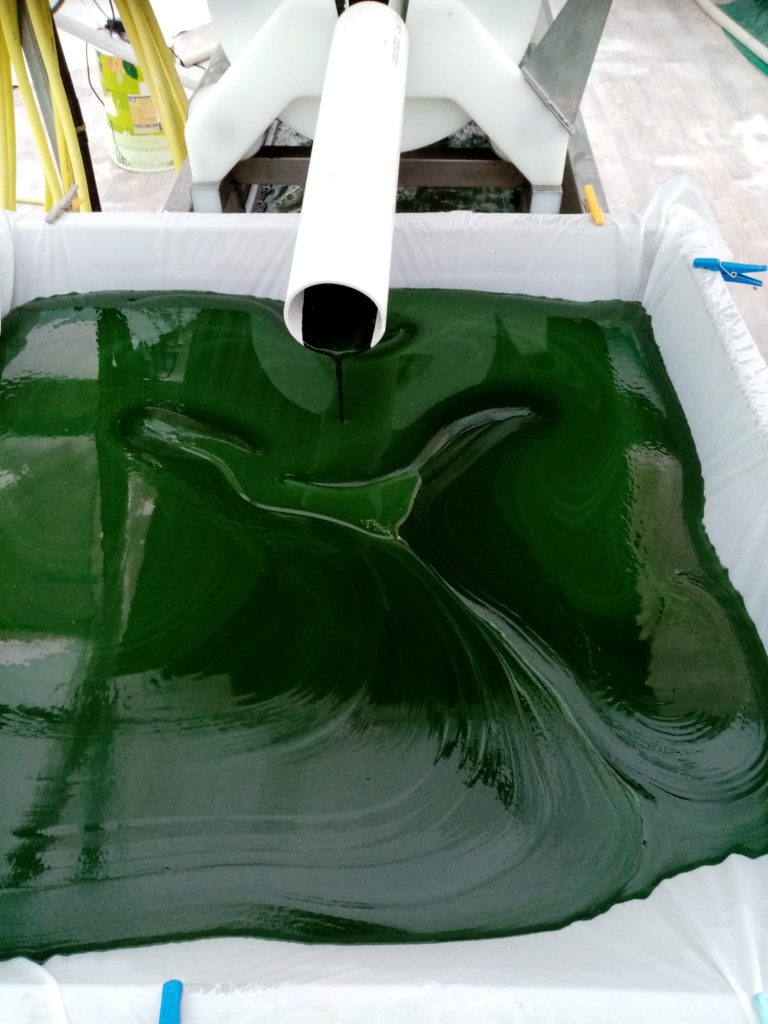 De son côté, la spiruline va rester “piéger” et tomber dans une goulotte de récolte pour s’égoutter au bout du circuit.
