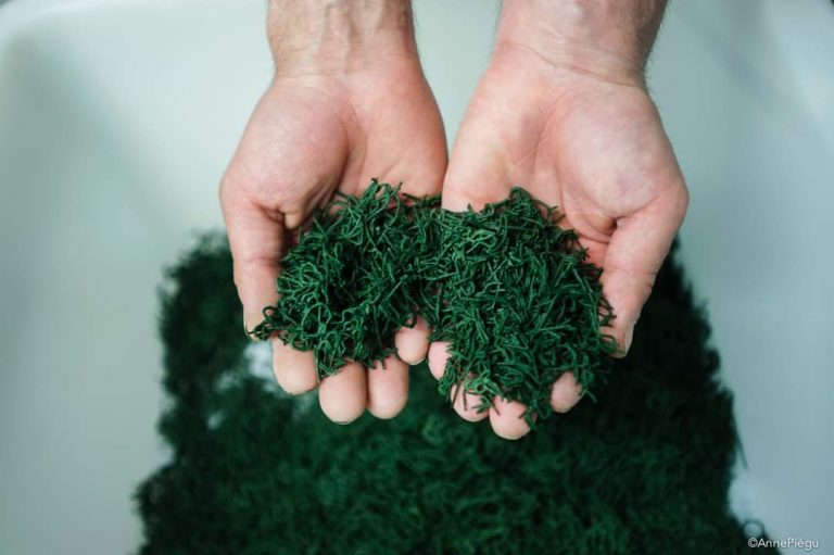 A ce stade de fabrication, l’algue va avoir une consistance de caillé de fromage. Alors, elle va être pressée au maximum pour obtenir une sorte de pâte à modeler verte.