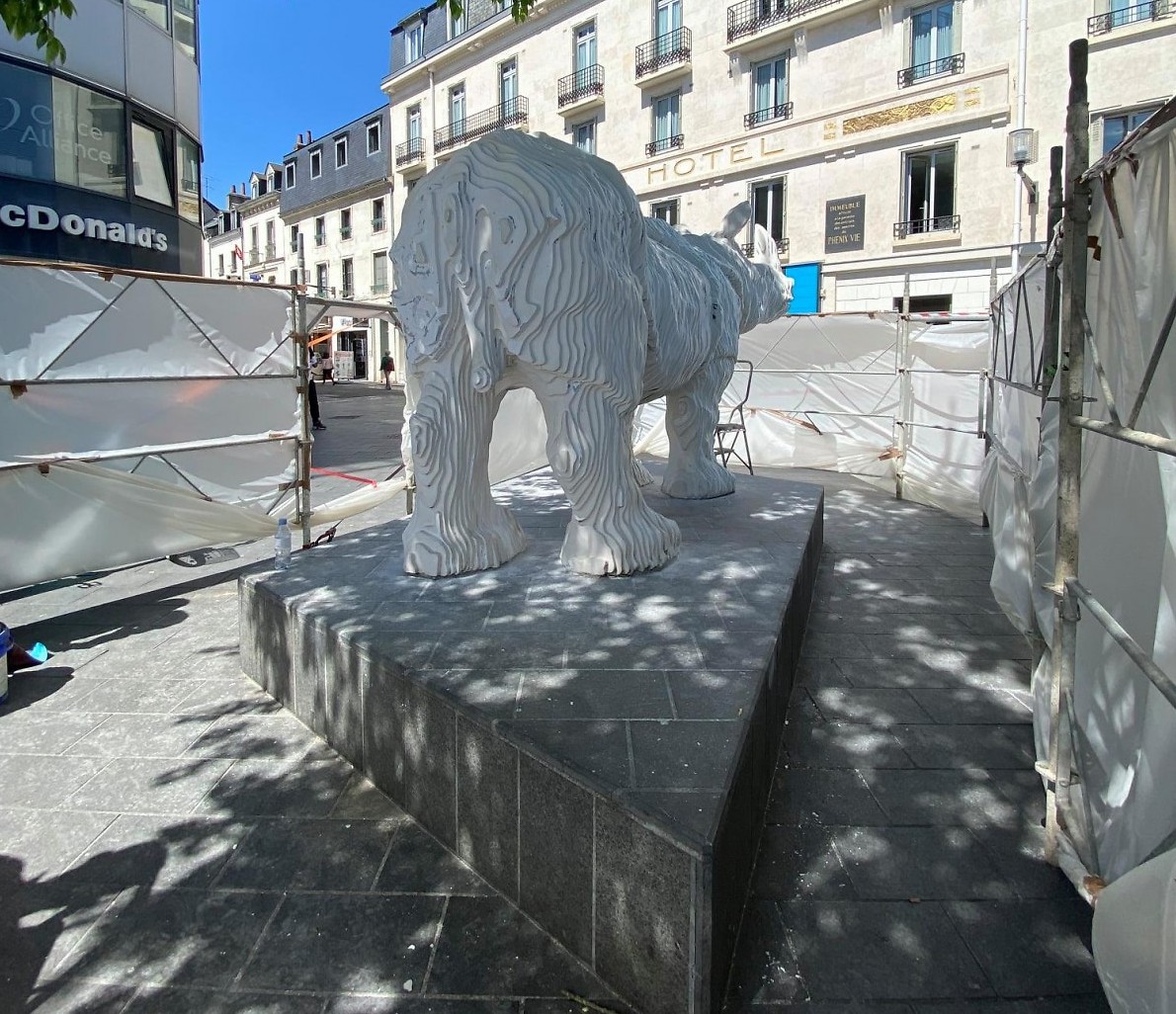 Ce rhinocéros en résine qui fait 4m50 de long pour 1m20 de haut c’est le résultat du travail de Michel Audiard, célèbre sculpteur basé à Rochecorbon qui a récemment produit un ours immergé dans la Méditerranée à Marseille. Ce genre de projet majeur c’est une de ses marques de fabrique mais on le retrouve aussi dans des missions bien différentes comme récemment pour concevoir des fèves de galettes des rois ou un tire-bouchon moulé à partir de la main de son propriétaire.
