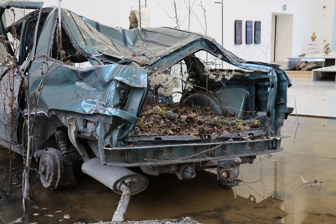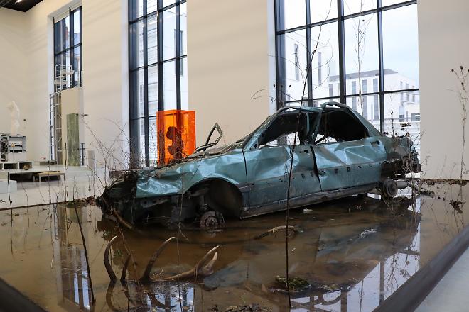 Depuis quelques temps, on voit fleurir sur les réseaux sociaux des photos d’une voiture en ruines, posée dans une marre d’eau stagnante et recouverte de feuilles et autres éléments naturels. Non ce n’est pas un propriétaire qui a laissé pourrir son automobile, mais bel et bien une partie de la nouvelle exposition « Times in Collapse » de l’artiste péruvien Nicolas Lamas, présente dans la Nef du CCC OD à Tours en haut de la Rue Nationale.