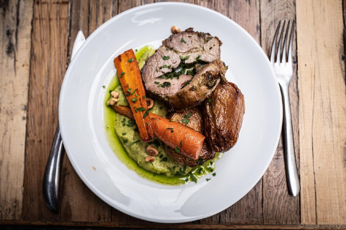 Pour le plat, on aurait pu commander l’aubergine fondante avec tomates cerise grillées et polenta à la sauge (recette créative) mais tout le monde voulait goûter les pommes de terre tapées accompagnant l’échine de porc roulée aux herbes. Une réussite d’ailleurs, c’était tout fondant, et équilibré avec les carottes rôties cuites à cœur et un caviar de courgette tout doux en bouche. On a arrosé ça d’un rouge baptisé L’Enfant Terrible, vin léger offrant un joli accord.
