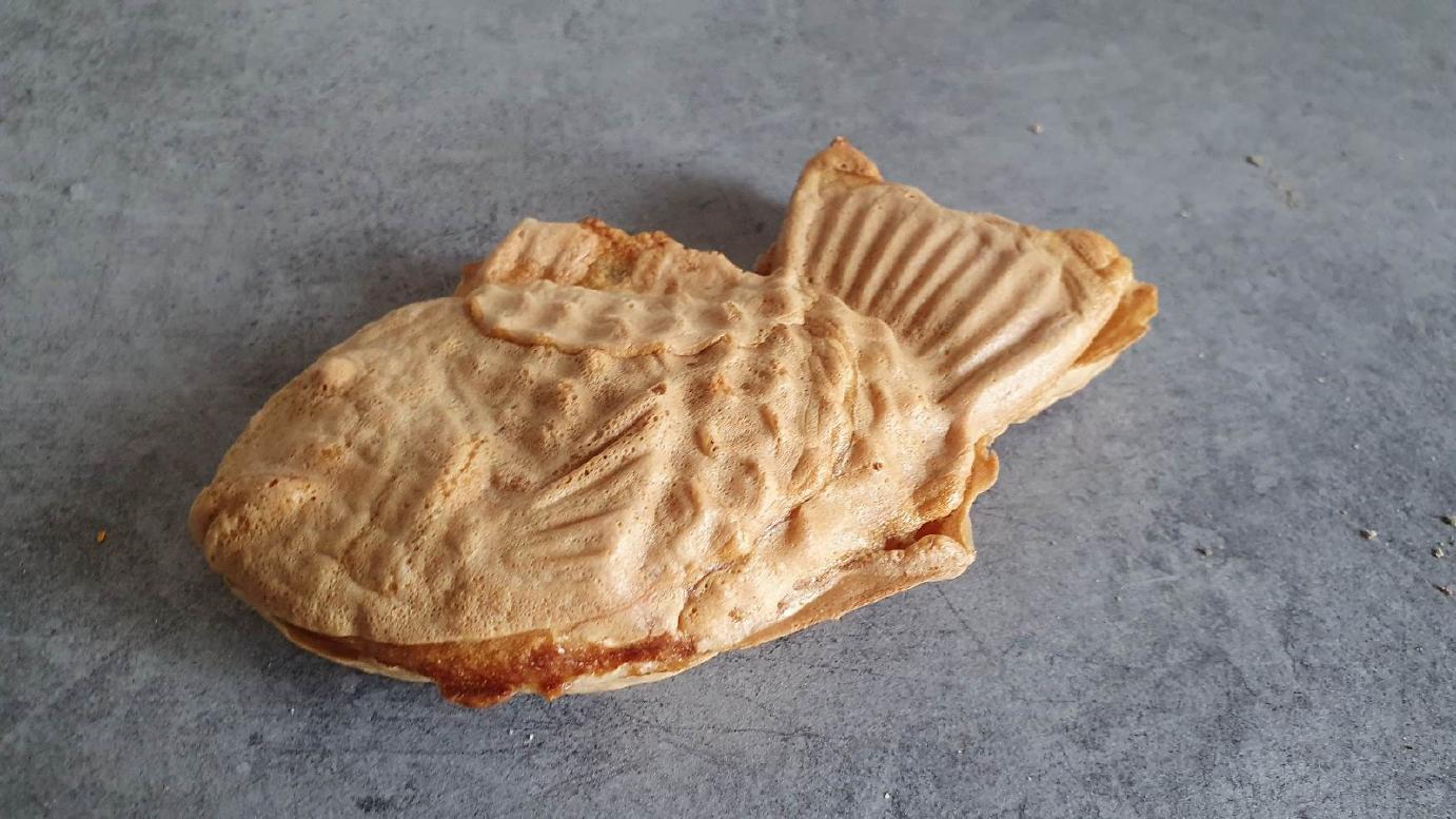 On a faim donc on en prend trois : saumon (le plus classique, passe-partout), prune (le plus surprenant, « attention au noyau » prévient l’étiquette) et bonite séchée (le plus goûtu). Des onigiris qui se tiennent bien, qui ont du goût (c’est quand même assez salé) et qu’on accompagne d’une soupe miso de bonne qualité. On complète avec un dessert, ici des gaufrettes en forme de poisson servies juste chaudes avec plusieurs garnitures (on a pris crème vanille et c’était un bon choix, il parait que la recette est très populaire au Japon).