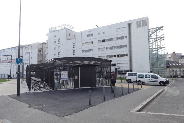 Situé juste à côté de la station de tram, à proximité de l’Ilot Vinci, cet abri sécurisé comporte 120 places pour vélos en intérieur, accessibles moyennant un pass à 15€ par an ou gratuitement si on dispose d’un abonnement mensuel Fil Bleu (quelle que soit la tarification). En parallèle il y a 48 places pour accrocher des vélos à l’extérieur, utilisables par tout le monde sans aucune condition (mais de préférence avec un bon antivol).
