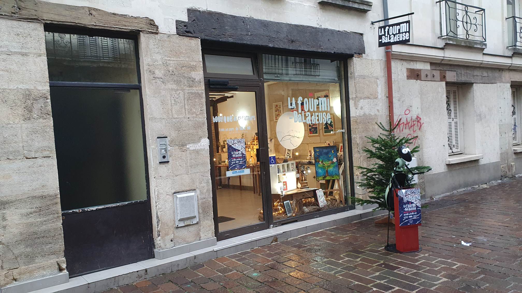 On commence avec La Fourmi Baladeuse qui, comme son nom l’indique, voyage d’année en année. Pour 2021, elle a réinvesti un terrier déjà expérimenté dans la Rue des 3 Ecritoires, à quelques dizaines de mètres de Halles et de la Place du Monstre. Un beau local ancien avec pierres et poutres apparentes qui rassemble une dizaine de créatrices et créateurs et qui ouvre ses portes tous les jours jusqu’au jeudi 30 décembre entre 10h et 19h.