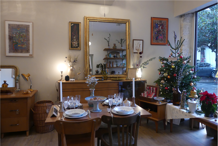 Agencé comme un appart, le magasin regorge de belles pièces qui datent souvent des années 50, 60 ou 70… Voire plus anciennes pour quelques-unes, comme ce miroir monumental de 150 ans qui trône fièrement dans la pièce le jour de notre venue. A ses côtés, des bureaux, buffets, tables, chaises, assiettes, verres, bibelots ou luminaires. Un stock qui évolue au fil des pépites dénichées par la famille sachant que les réparations et remises en état sont réalisées par Anne directement dans l’atelier situé en arrière-boutique (ou chez elle pour les plus grosses pièces). Elle recrée notamment des lampes à partir de pièces détachées.