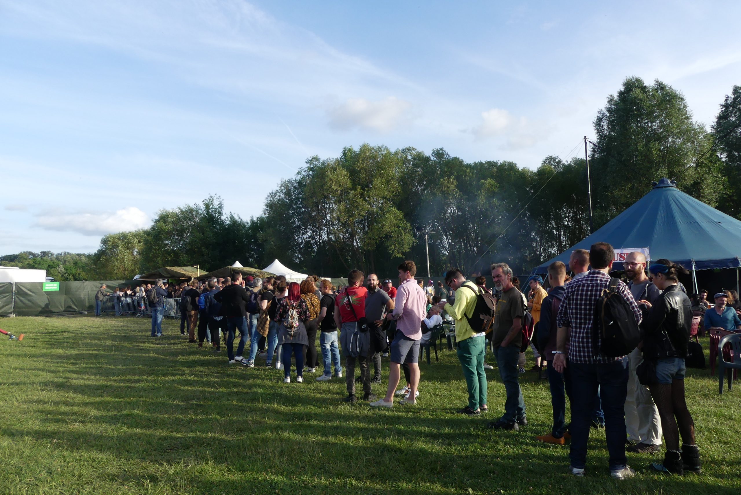 Les portes se sont ouvertes dès 19h et tout de suite on a vu se former une queue énorme pour prendre des tickets boissons et sandwichs à la banque du festival. C’est simple, la file remontait quasiment jusqu’à l’entrée soit environ 150m. Une fois les précieux sésames en poche, on pouvait en profiter aux bars, toujours à thème (donc avec costumes…