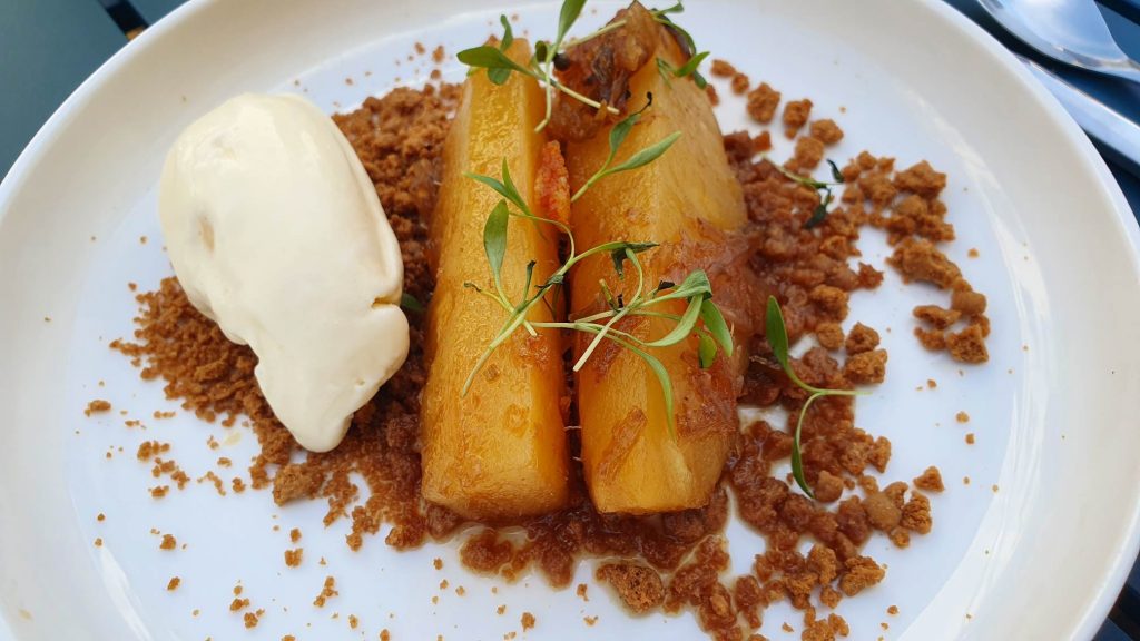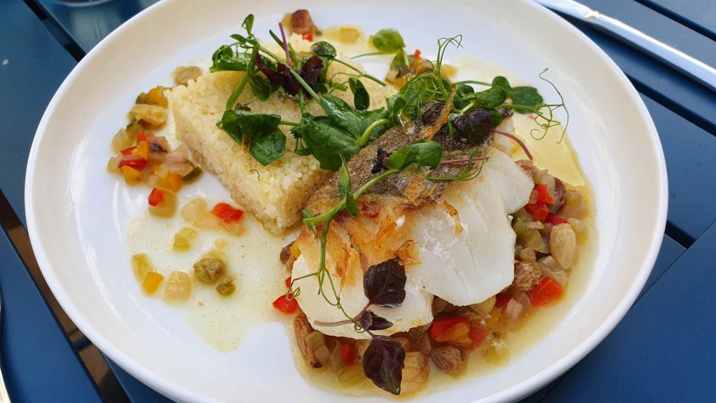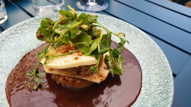 La formule entrée-plat-dessert est à 36€ avec trois choix à chaque fois, pour une cuisine garantie maison et minute. On commence par exemple par un mille-feuilles d’igname (légume racine) avec effiloché de dinde et surtout… sauce chocolat. Attention, ici on n’est pas dans le sucré-salé. Et si on sent bien le goût chocolat, il accompagne convenablement la viande, servie en prime avec une salade assaisonnée sans fausse note.