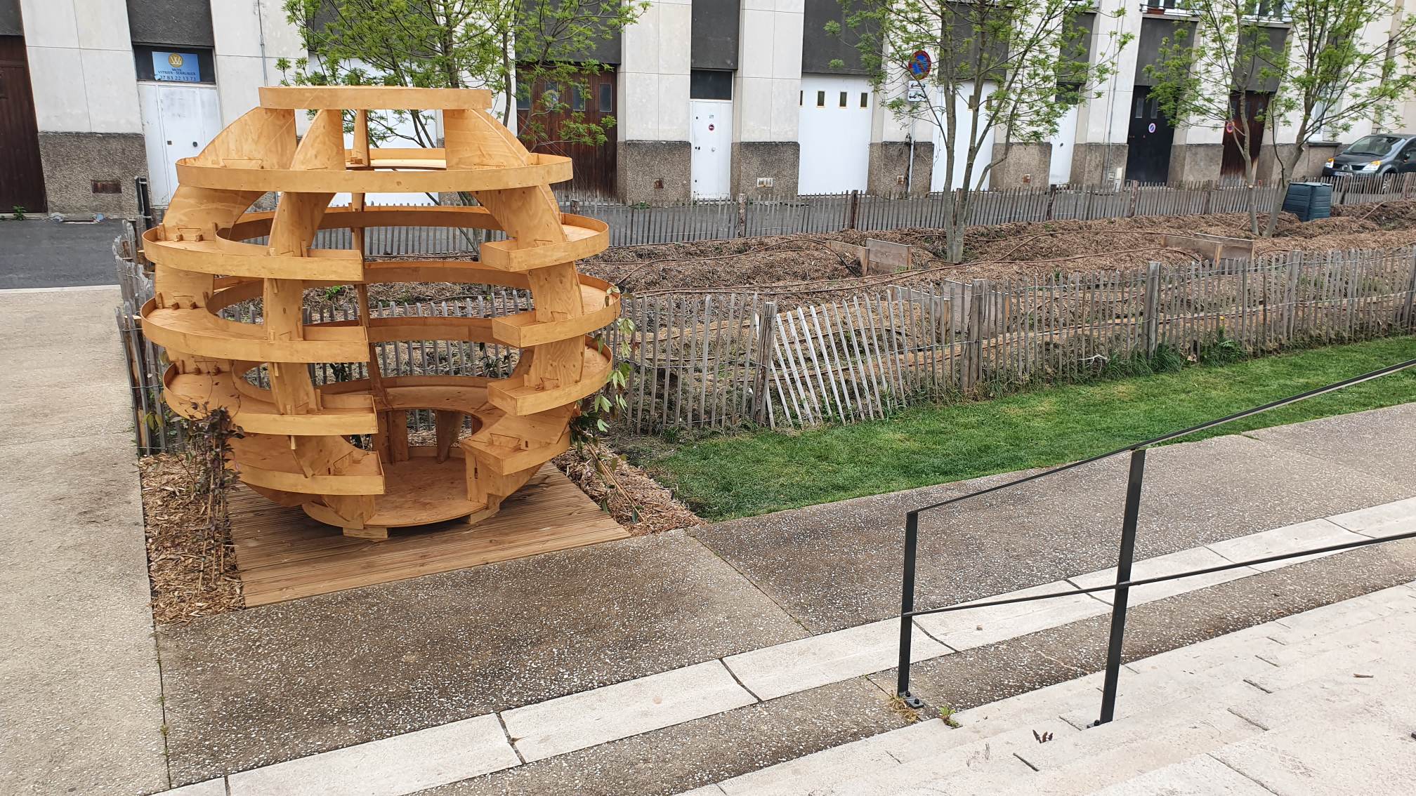 Sur le côté ouest du bâtiment, face aux galeries en verre, on peut désormais découvrir une grosse boule en bois d’environ 2m de haut. C’est ça une growroom. En fait il s’agit d’un potager urbain, donc d’une structure élégante vouée à accueillir des plantations comme des aromates, par exemple. L’idée d’avoir ce genre de dispositif nous vient d’un architecte danois : Mads-Ulrick Husum qui a non seulement mis au point le concept mais en a aussi partagé les plans avec le monde entier pour favoriser sa multiplication.
