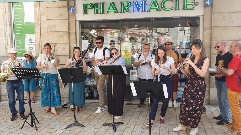Y’a de la joie en mode orchestre devant la pharmacie à l’angle de la Rue de la Scellerie et de la Rue Buffon. C’était ce mardi 13 juin vers 12h30 à Tours… et ce n’était pas un before de la Fête de la Musique. Il s’agissait d’un happening de musiciennes et musiciens de l’Opéra de Tours, mobilisés pour obtenir un meilleur statut et davantage de moyens pour leurs prestations.