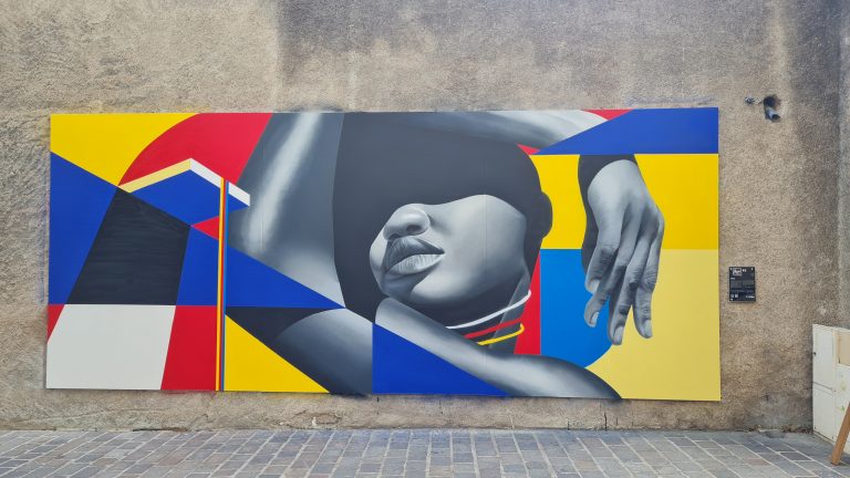 Il a également été invité par le M.U.R Tours donc pour réaliser une fresque dans le vieux-Tours. L’artiste y a réalisé une œuvre de son univers actuel qui mêle formes géométriques et représentations réalistes. Pour sa fresque passage du Pèlerin, l’artiste s’est interrogé sur le réchauffement climatique et ses conséquences comme la sécheresse. « J’ai voulu montrer une femme africaine qui se cache les yeux à cause du soleil, car l’Afrique est le premier continent impacté par le réchauffement climatique. A côté j’ai fait quelque chose de très graphique un peu à la Mondrian. J’ai inséré un plongeoir pour symboliser une piscine et faire écho au manque d’eau. » nous décrit Skio au sujet de cette fresque.