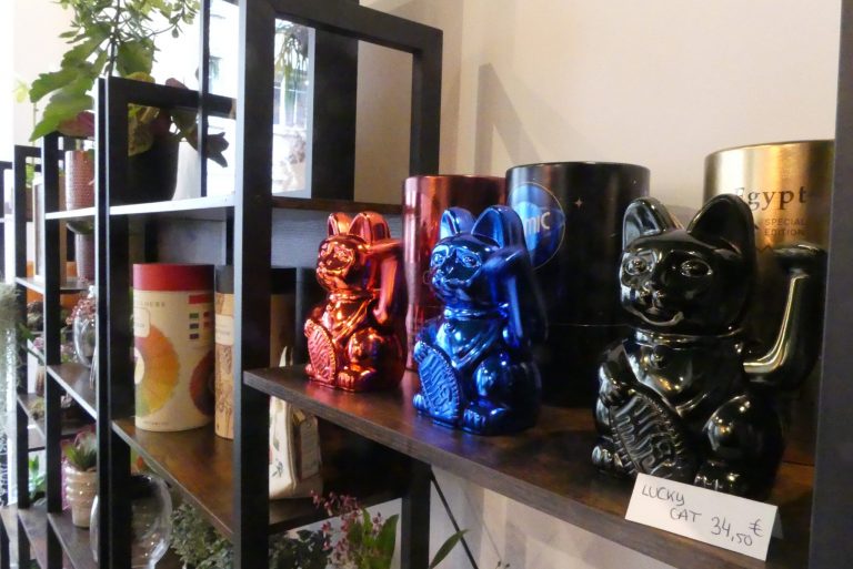 D’ailleurs, globalement, la mise en scène des étagères est soignée, avec des attendus et des surprises (les petits chats qui bougent la patte ou des objets artisanaux mexicains et guatémaltèques, présents ici car inspirés d’un voyage au Mexique où Susan a été impressionné par le rapport local à la mort, mettant plus l’accent sur la célébration que la tristesse). Vu aussi : les vêtements de la marque tourangelle Wazashirt ou les œuvres des artistes Pascal Honoré (peintures) et Florence Cordy (céramique). De nouvelles expositions sont d’ailleurs prévues tous les 3 mois.