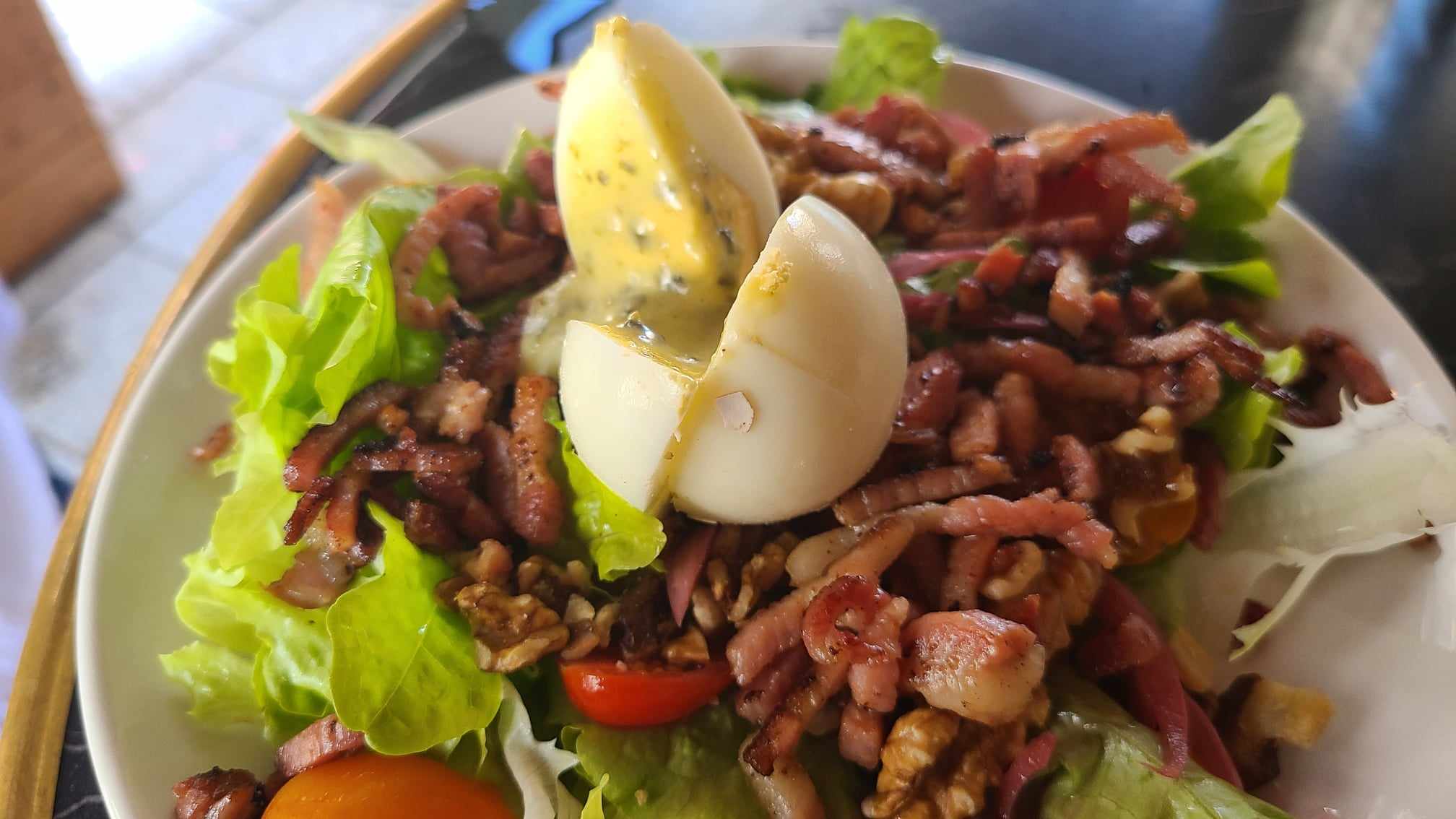 Le jour de notre venue, on débute avec une salade avec lardons, œuf mayo et des petits pickles d’oignons appréciés pour apporter un peu de fraîcheur. Suit une araignée de porc parfumée au thym avec une purée de patate douce. Le plat arrive rapidement mais bien tiède, en tout cas les assiettes sont généreuses et la promesse respectée. On est bien dans un bistrot de centre-ville où l’on se pose pour bien se caler avant de repartir.