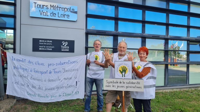 Quelques jours après l’annonce du renouvellement de la délégation de service public de l’aéroport de Tours à la société Edeis avec un projet devant amener le nombre de passagers jusqu’à 326 000 par an d’ici 2035, les élus de Tours Métropole, réunis en session plénière, ont été accueillis par quelques militants du collectif « Grands Parents pour le Climat ».