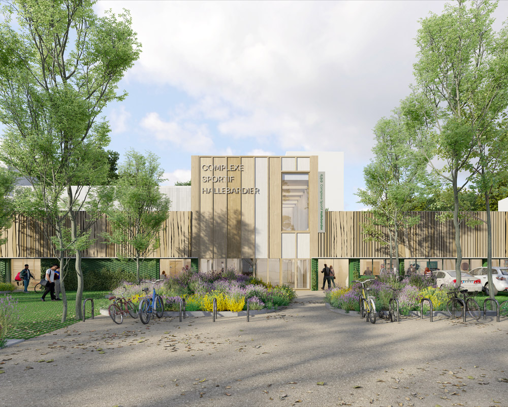 « L’ensemble bâti du complexe sportif dessine une emprise au sol de forme carrée. Cela permet une compréhension simple de l’équipement et donne force au repère urbain. Le projet a pour objectif de réhabiliter les deux salles existantes du complexe sportif du Hallebardier et de bâtir une extension, afin d’offrir une lecture architecturale unique du complexe sportif« argumente de son côté l’agence parisienne Engasser qui a conçu le bâtiment.