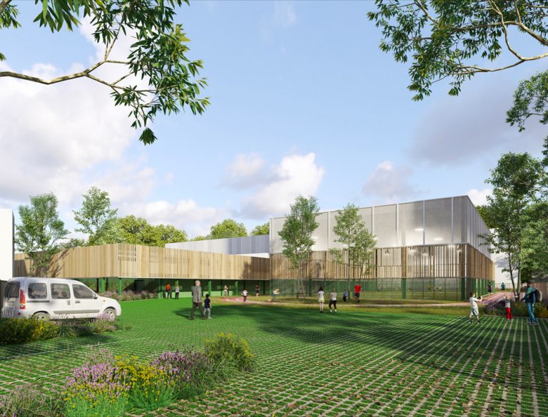 La structure aura une ossature bois dit biosourcé. « À l’Est, la salle omnisport prend le volume principal de la construction, visible depuis le lointain, mais écartée de plus de 8m des immeubles de logements existants. De plus, une faille Nord-Sud est créée entre les volumes des deux salles existantes conservées et l’extension » poursuivent les concepteurs. Le parvis sera végétalisé et des haies sont prévues sur les côtés pour accentuer les aménagements naturels. Des plantes grimpantes sont également prévues. Et il y aura du végétal sur les toitures.