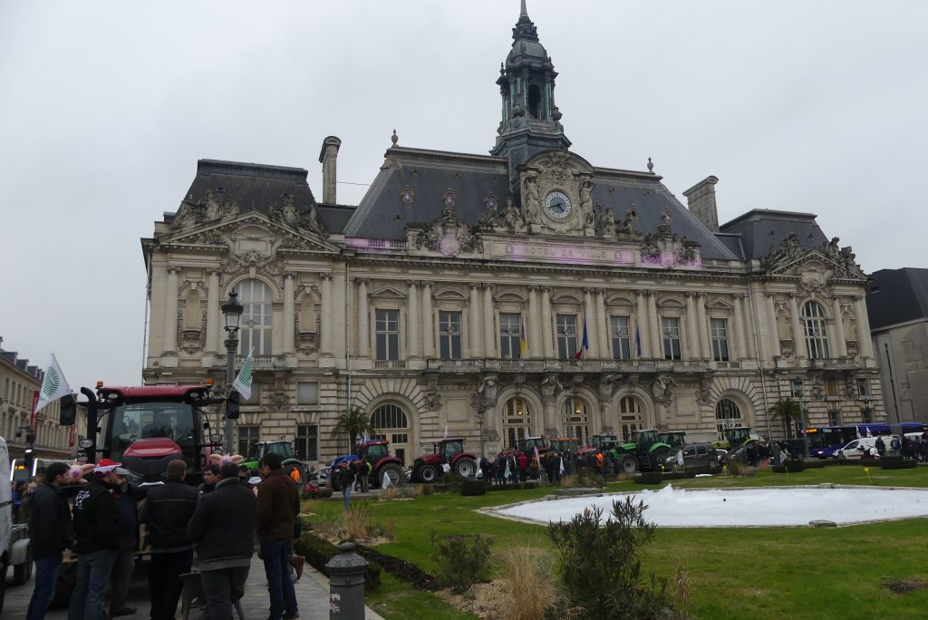 FNSEA et Jeunes Agriculteurs se sont installés Place Jean Jaurès à la mi-journée après deux opérations escargot mené depuis le rond-point de l’Avion à Parçay-Meslay et le rond-point de l’hippodrome à Chambray.