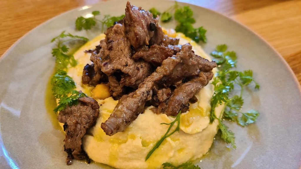 Le jour de notre venue on se laisse tenter par la formule déjeuner qui commence avec une entrée en 3 services : 4 falafels bien chauds au cresson. Super idée, assaisonnée avec une sauce au yaourt toute douce, un houmous (bon, mais un peu gras) et des pickles coquins pour la fraîcheur. Derrière on déguste un bœuf bien juteux qui a au préalable mariné dans la cardamome. Il s’accompagne de pois chiche en majesté : juste glacés, et en houmous tiède.