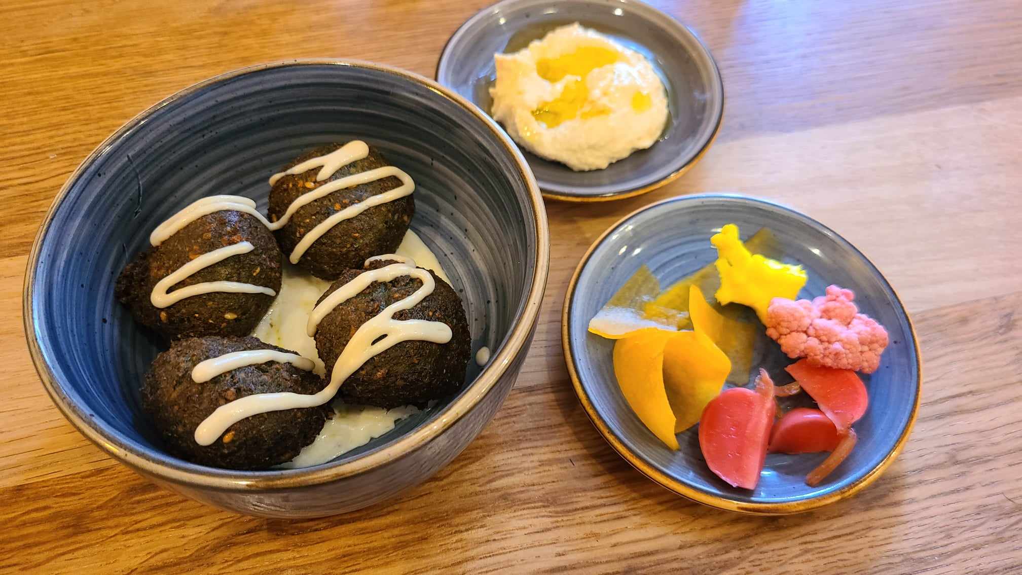 Le jour de notre venue on se laisse tenter par la formule déjeuner qui commence avec une entrée en 3 services : 4 falafels bien chauds au cresson. Super idée, assaisonnée avec une sauce au yaourt toute douce, un houmous (bon, mais un peu gras) et des pickles coquins pour la fraîcheur. Derrière on déguste un bœuf bien juteux qui a au préalable mariné dans la cardamome. Il s’accompagne de pois chiche en majesté : juste glacés, et en houmous tiède.