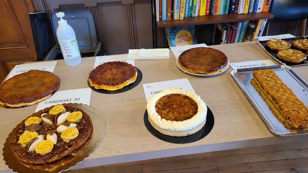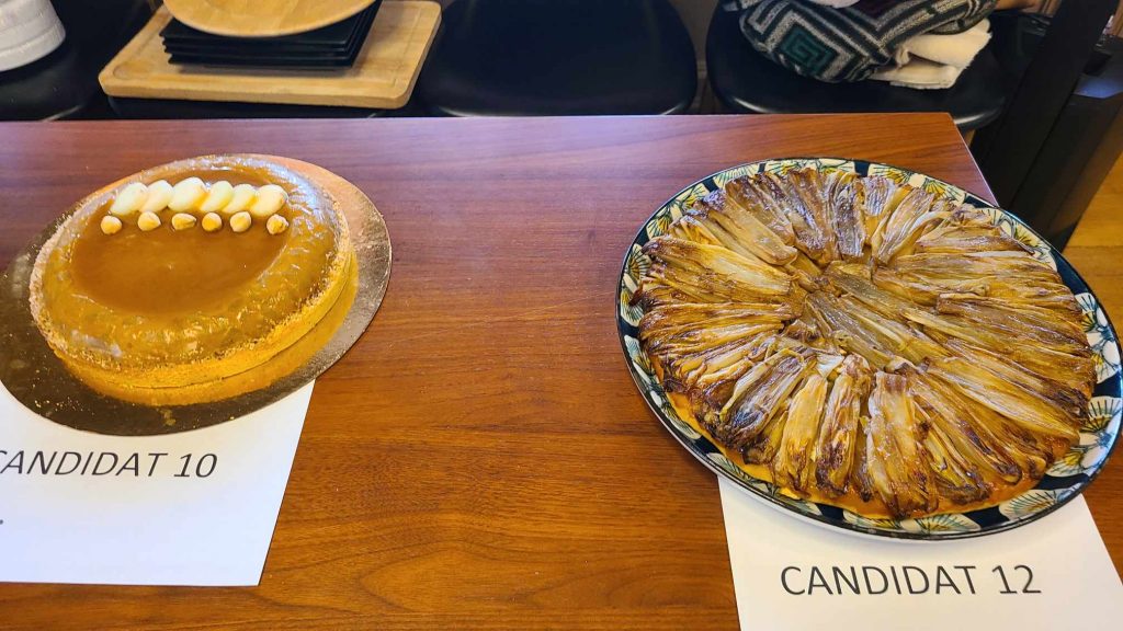 La compétition était divisée en deux catégories : les tartes tatin traditionnelles et les recettes créatives. Dans ce domaine, tout était plus ou moins permis : recettes salées, changement du fruit de base, excentricités de présentation… On a donc eu une tarte tatin rectangulaire, une autre aux rillons, une recette aux asperges, une aux endives… Plusieurs ont utilisé de la crème… Il y a clairement eu de l’inventivité. Parfois c’était réussi, parfois mois. Et globalement, on a trouvé que de nombreux échantillons avaient un peu abusé du sucre.