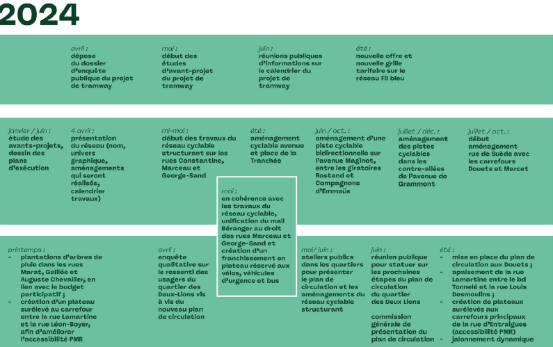 D’ici la fin de l’année, ce modèle va s’étendre. La traversée du Boulevard Béranger sera rendue impossible, sauf pour les véhicules de secours ou les vélos. En mai-juin, une piste cyclable à double sens sera créée des Tanneurs aux Prébendes via les rues Constantine et Marceau. Réalisée en complément de celle des rues Voltaire et Buffon, elle permettra d’interdire la Rue Nationale aux cyclistes.
