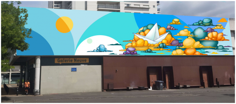 Explications : 5 lieux ont été déterminés (Façade de l’école Michelet ; Piscine Gilbert Bozon ; Pignon 10 Charles de Gaulle ; Passage de Luynes / Boulevard Charles de Gaulle ; Galerie neuve / 3 rue André Theuriet). A chaque adresse correspond un artiste local du collectif Blumonday (Paf Le Piaf, GIL KD, Koye & Enora, Monsieur Plume et Deux Mètres).