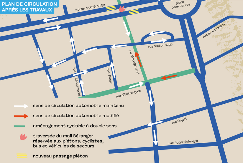 Ce projet est la suite logique de la création d’une piste cyclable à double sens Rue Marceau et de l’aménagement d’un plateau surélevé dédié aux cyclistes sur le mail Béranger. Un plateau qui empêche la traversée du Boulevard, sauf pour les piétons, les vélos, les véhicules de secours ou les bus en déviation.