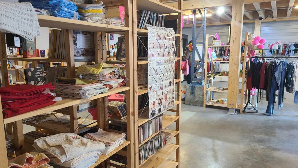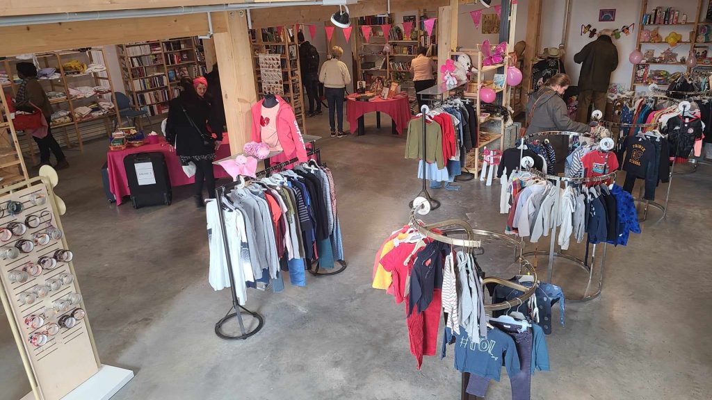 Désormais, l’équipe de 10 salariés et 35 bénévoles dispose de deux étages pour le tri des dons (vêtements, jouets vaisselle), son atelier couture (pour réparer ce qui peut être remis à neuf ou recyclé) et surtout sa boutique. Au rez-de-chaussée, on trouve tout un rayon pour les vêtements des enfants, les jouets et la vaisselle. A l’étage, les vêtements pour hommes et pour femmes. Une simple porte fait la jonction avec les coulisses comportant les bureaux ou la zone de tri.