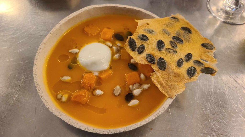 La carte, justement. Elle propose deux menus : entrée-plat-dessert à 29€ le midi, 44€ pour le menu du soir. La carte est ultra-courte avec au total 5 entrées, 5 plats, 4 desserts et une planche de fromages. On opte pour un menu du midi en commençant par un velouté de butternut habilement assaisonné d’huile de tournesol et d’une crème au Sainte-Maure-de-Touraine. S’ensuit une queue de bœuf bien moelleuse entourée d’un chou surmonté de pickles de graines de moutarde, servie avec des légumes d’hiver. Avant la bonne surprise du repas : un gâteau au millet avec amandes et crème anglaise à la fève de tonka.
